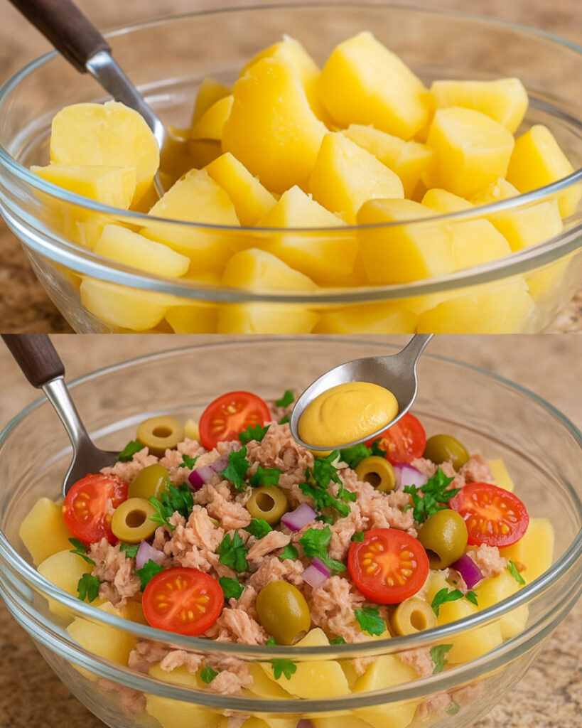 Sprød kartoffelmossalat Ingredienser: 800 g små kartofler 3 spsk olivenolie 1 tsk salt 1/2 tsk sort peber 1 tsk sød paprika 1 tsk hvidløgspulver 1 spsk fuldkornssennep 1 spsk æblecidereddike …