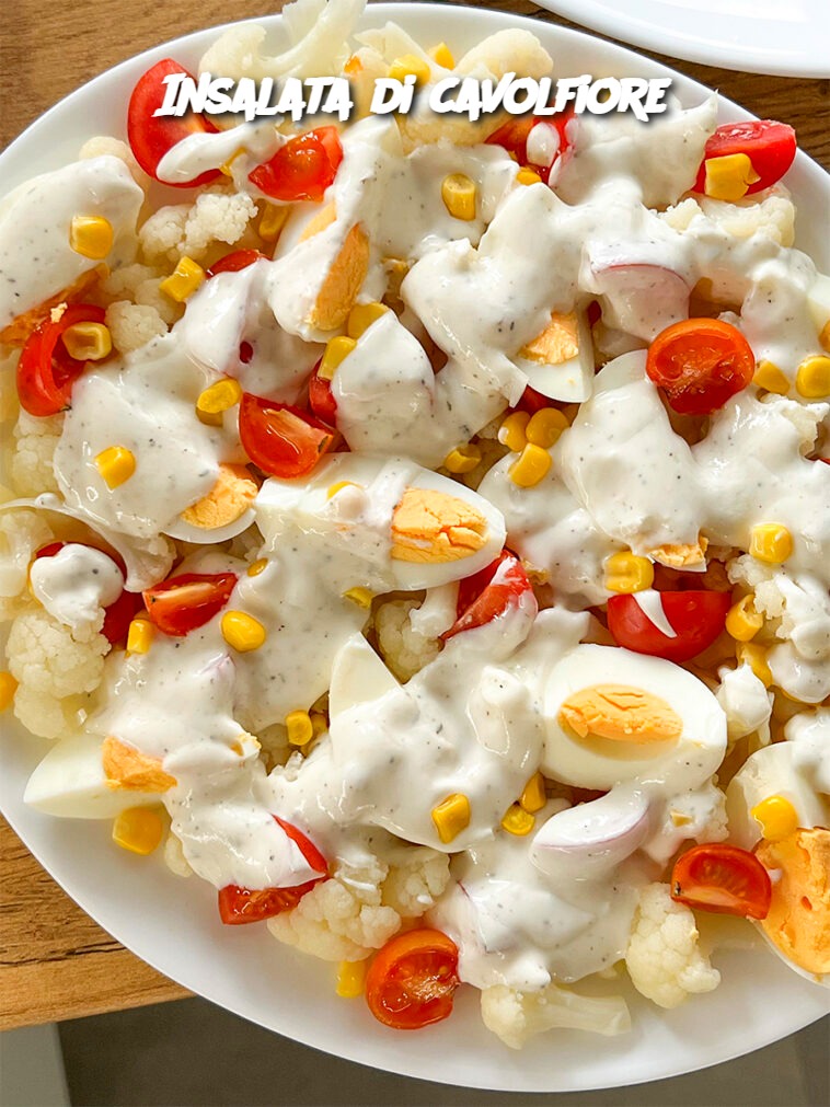 OPSKRIFT PÅ BLOMKÅLSSALAT Ingredienser – et halvt hoved – 3 æg – 8 cherrytomater – 2 spsk. dåsemajs – 1 spsk. mayonnaise – 4 spsk. naturel yoghurt – 2 fed …