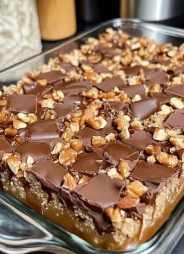 Krämiga, krispiga och oemotståndligt kladdiga Dessa choklad- och karamellrutor med nötter är en riktig dröm för alla som älskar söta, tuggiga desserter. Ett lager krispig kexbotten, överdraget med len karamellsås, …