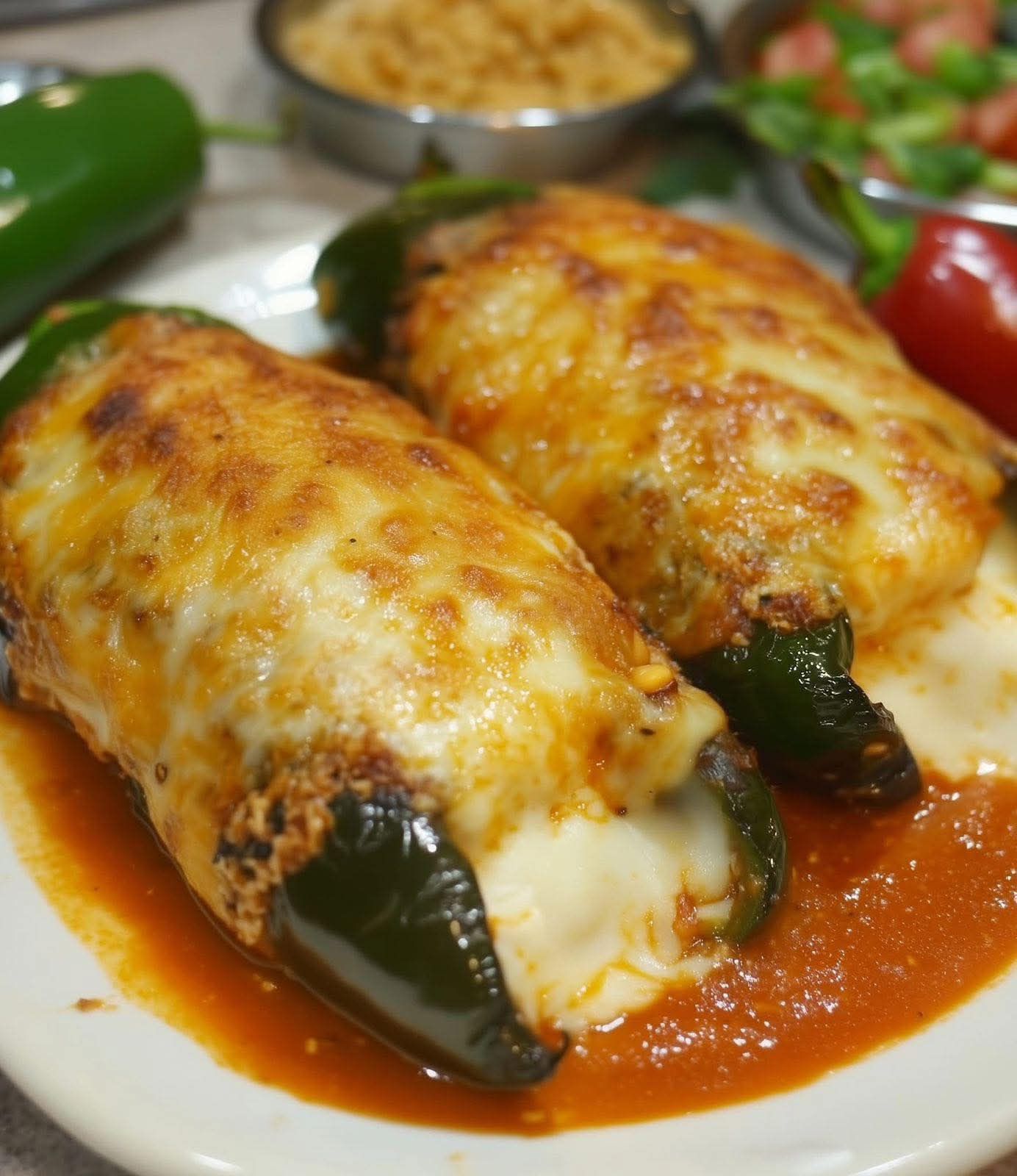 These cheesy stuffed poblano peppers are roasted, filled with a savory beef and rice mixture, and topped with gooey melted cheese and a rich tomato sauce. They bring bold flavor and comforting textures in every bite.