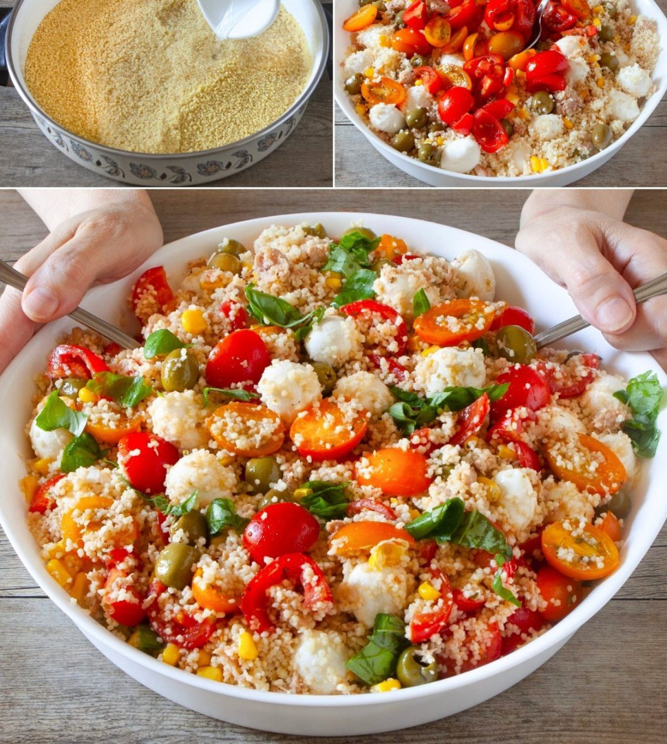 Når den er færdig, løsnes couscousen med en gaffel for at adskille kornene og lad den køle lidt af. Du kan tilsætte en smule olivenolie for at forhindre kornene i at klistre sammen.