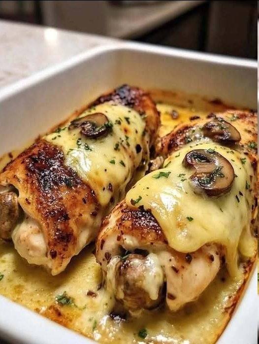 Denne ostefyldte svampefyldte kylling er en restaurantværdig ret, der er overraskende nem at lave derhjemme. Møre kyllingebryster fyldes med en velsmagende svampeblanding, bages til de er gyldne og toppes med smeltet ost. Hemmeligheden? At brune kyllingen kort inden bagning for at holde på saften og skabe en smagfuld skorpe.