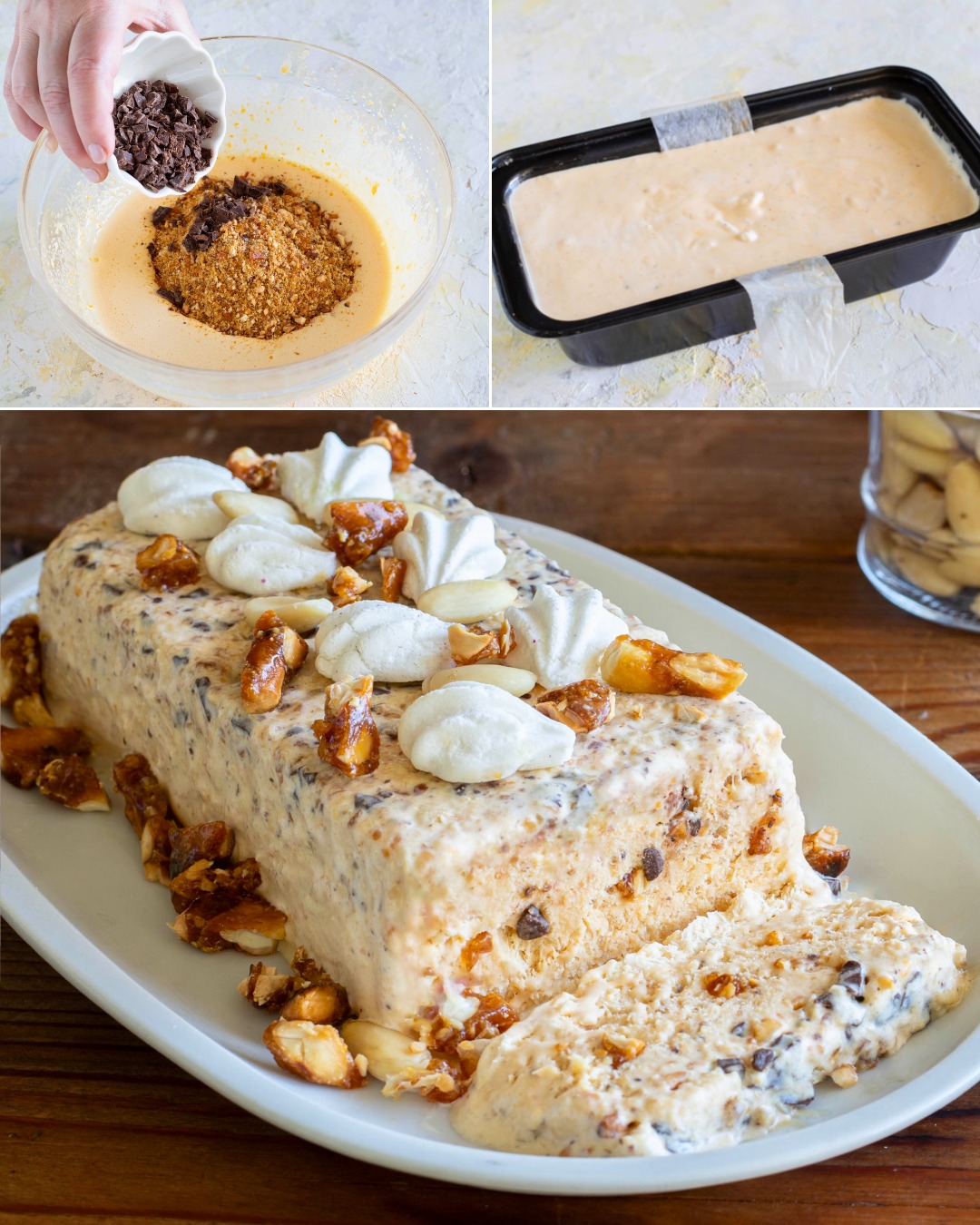 Beklæd en semifreddo-form med bagepapir, og lad der være udhæng i siderne, så den lettere kan tages ud.