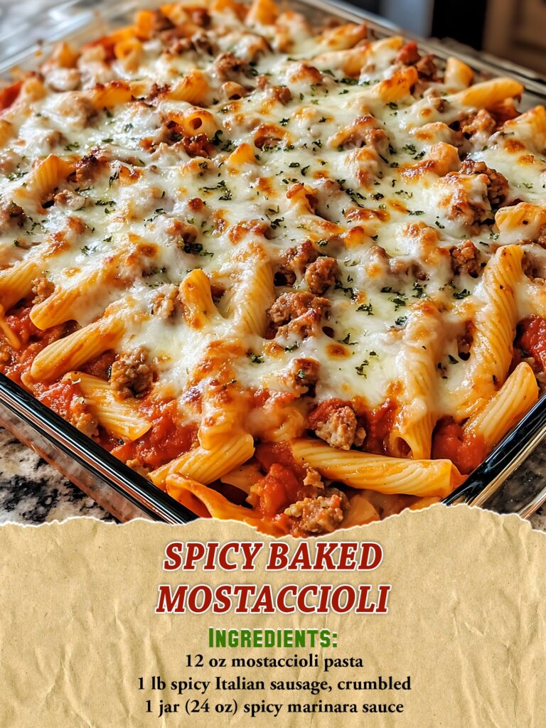 Ingredients:12 oz mostaccioli pasta1 lb spicy Italian sausage, crumbled1 jar (24 oz) spicy marinara sauce2 cups mozzarella cheese, shredded1 cup ricotta cheese½ cup Parmesan cheese, grated1 tsp red pepper flakes1 …