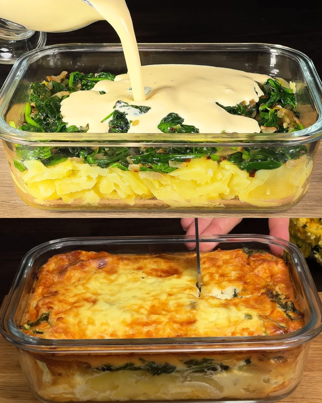 Denna tröstande gryta varvar möra potatisar med sauterad spenat och lök, allt täckt av en fyllig, krämig äggblandning och bakat till gyllenbrun perfektion. Den är enkel, mättande och perfekt för lunch eller middag.