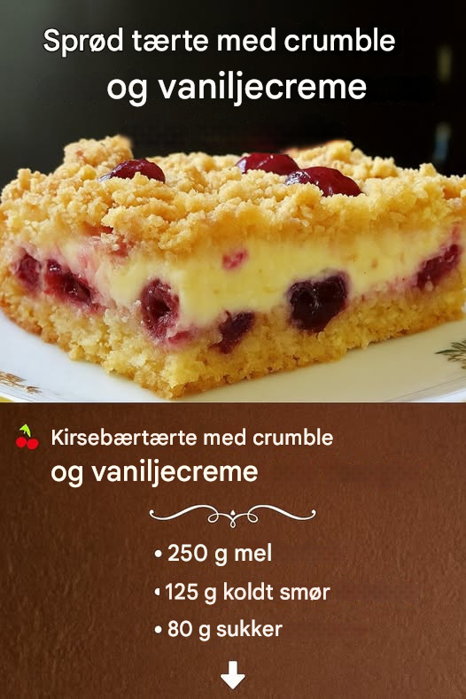 Smuldret tærte med vaniljebudding og kirsebær under kanelcrumble En dessert med en cremet midte, en omsluttende aroma og et uimodståeligt frugtigt præg: denne smuldrende tærte med vaniljebudding og kirsebær, toppet med en delikat kanelcrumble, er perfekt til enhver lejlighed. Ingredienser Til mørdejsbunden: 250 g mel 125 g koldt smør 80 g sukker 1 æg 1 tsk bagepulver Til fyldet: 1 pose vaniljebuddingpulver 500 ml mælk 3 spsk sukker 1 dåse udstenede kirsebær (ca. 350 g afdryppet)